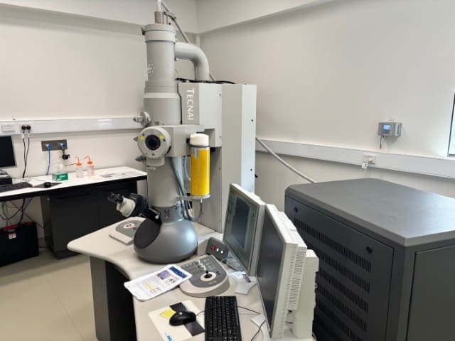 The Tecnai G12 Spirit TWIN transmission electron microscope (TEM) is a 120 kV TEM primarily used for biological sections, nanoparticles and negative stained samples. It has cryo-capabilities with the FEI Low Dose module as well as the electron tomography module. It has a Parfocal Magnification Series and TEM Scripting.